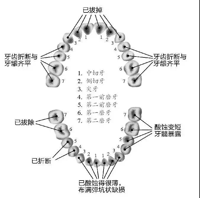 28颗牙齿已拔掉8颗、折断10颗其余的也没有一颗完整的