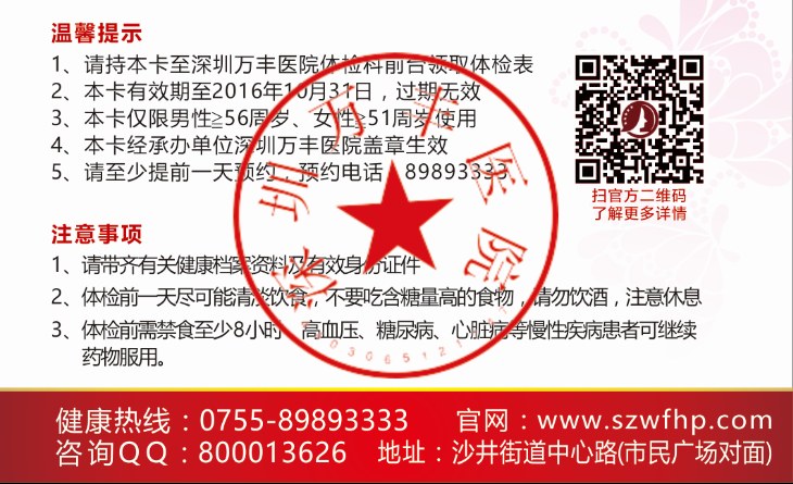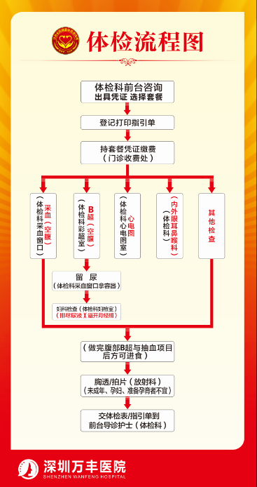 温馨提示:领取体检卡的朋友请合理安排自己的体检时间,为避免体检人数过多让您长时间等候,请提前一天按照体检卡上的电话0755-89893333预约,体检当天请直接到深圳万丰医院体检科领取体检表后按照以上流程进行相应的项目检查。