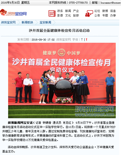 9月30日下午,沙井首届全面健康体检宣传月活动启动仪式在华一实验学校举行。在启动仪式上,沙井万丰医院为华一实验学校赠送12万元健康关爱体检基金。深圳宝安网以“沙井首届全面健康体检宣传月活动启动”为标题对此进行了报道。