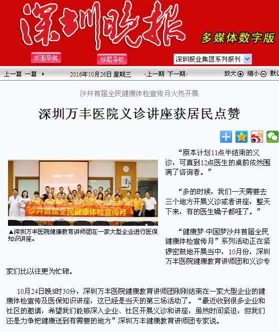 “健康梦·中国梦沙井首届全民健康体检宣传月”自9月30日启动以来,院内老年、少年儿童免费预约体检工作有条不紊地开展,院外各项义诊和讲座活动已经持续开展了十几场,广大市民对于深圳万丰医院为方便百姓而开展的与医生面对面交流的活动给予了高度的评价。深圳晚报于2016年10月26日在第A16版城区版块以“沙井首届全民健康体检宣传月火热开展——深圳万丰医院义诊讲座获居民点赞”为标题对此进行了新闻报道。