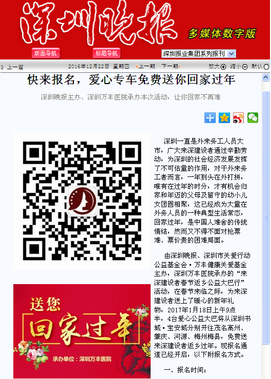 深圳晚报于2016年12月22日在第A17版块以“快来报名,爱心专车免费送你回家过年 ”为标题对此进行了新闻报道。