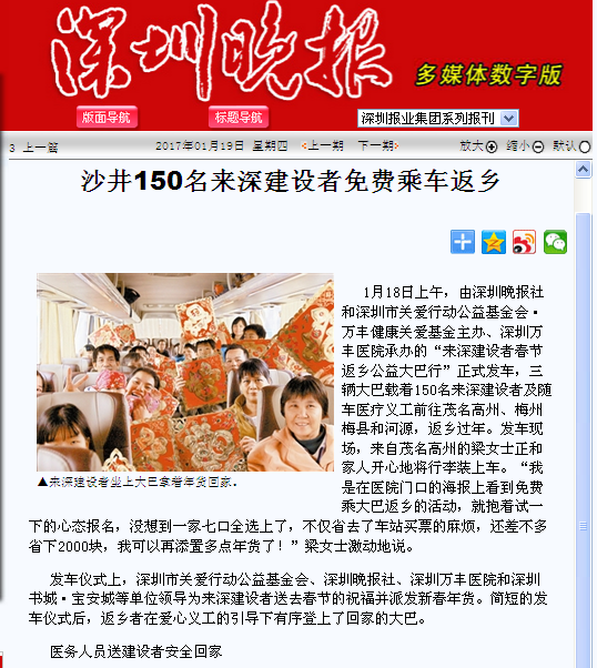 1月18日上午,由深圳晚报社和深圳市关爱行动公益基金会·万丰健康关爱基金主办、深圳万丰医院承办的“来深建设者春节返乡公益大巴行”正式发车,三辆大巴载着150名来深建设者及随车医疗义工前往茂名高州、梅州梅县和河源,返乡过年。深圳晚报于2017年1月19日对“沙井150名来深建设者免费乘车返乡” 为标题对此进行了新闻报道。