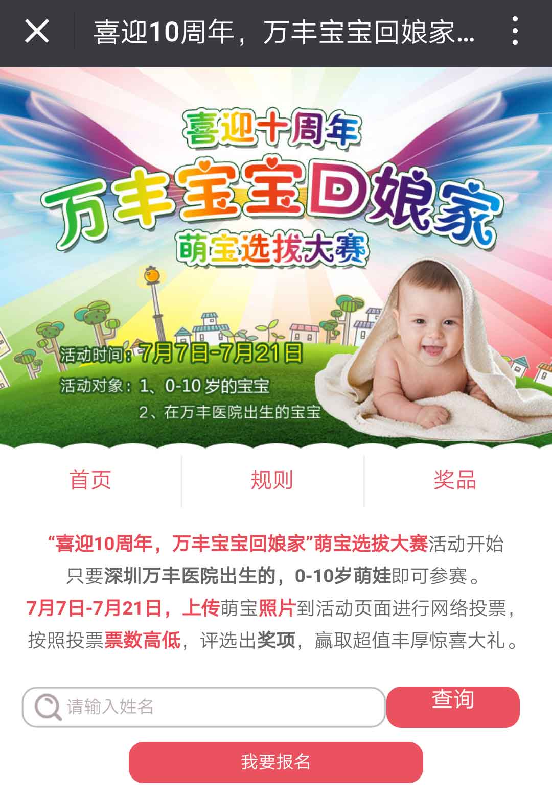 值此十周年之际,深圳万丰医院将举办“喜迎十周年·万丰宝宝回娘家”活动,我们将量身打造一场别开生面的亲子Party,玩游戏,展才艺,拿大奖。现诚挚邀请广大宝妈宝爸和准爸妈7月23日参与,齐聚一堂,共享大手牵小手的快乐。